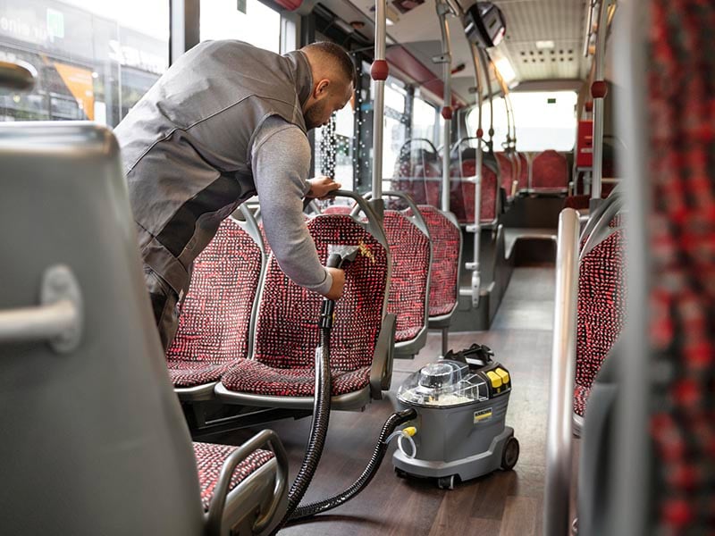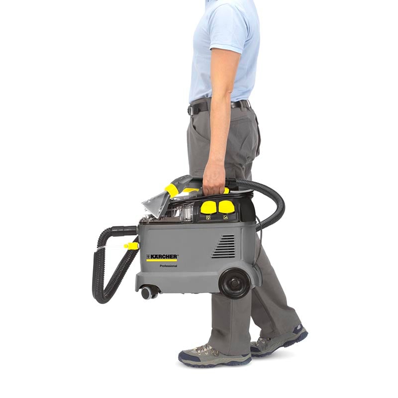 Durable, compact, efficient: The Puzzi 8/1 carpet extractor from Kärcher impressively cleans upholstery and removes stains from fabric surfaces with outstanding and hygienic cleaning results and high efficiency. The compact machine sprays the cleaning solution deep into the fabric fibers, dislodging dirt and then extracting it along with the solution. This efficient suction process also ensures fast drying, allowing the cleaned fabric surfaces to be used again quickly. This feature is especially beneficial for demanding cleaning tasks in places like hotels, hospitality businesses, or vehicle interiors. The standard, extra-short upholstery nozzle for convenient, ergonomic cleaning of narrow spaces can also be used.