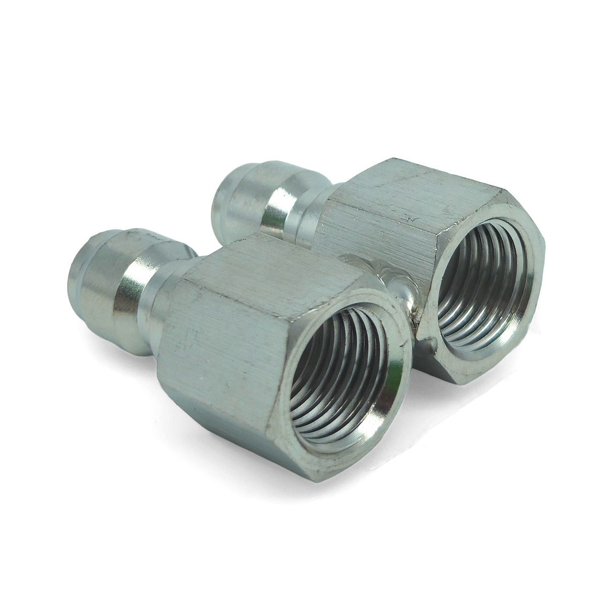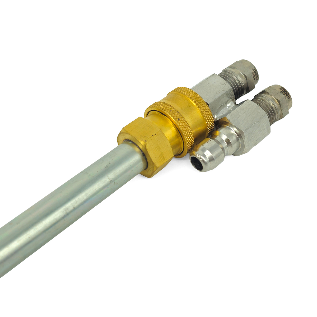 This handy tool allows you to quickly switch between two different nozzles on a spray gun wand. It accepts 1/4″ NPT-M thread spray nozzles and turns each into a quick connect tip.