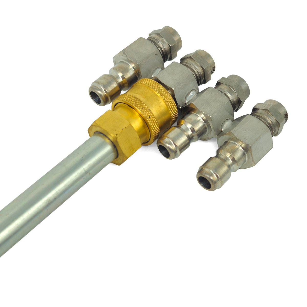 This handy tool allows you to quickly switch between four different nozzles on a spray gun wand. It accepts 1/4″ NPT-M thread spray nozzles and turns each into a quick connect tip.