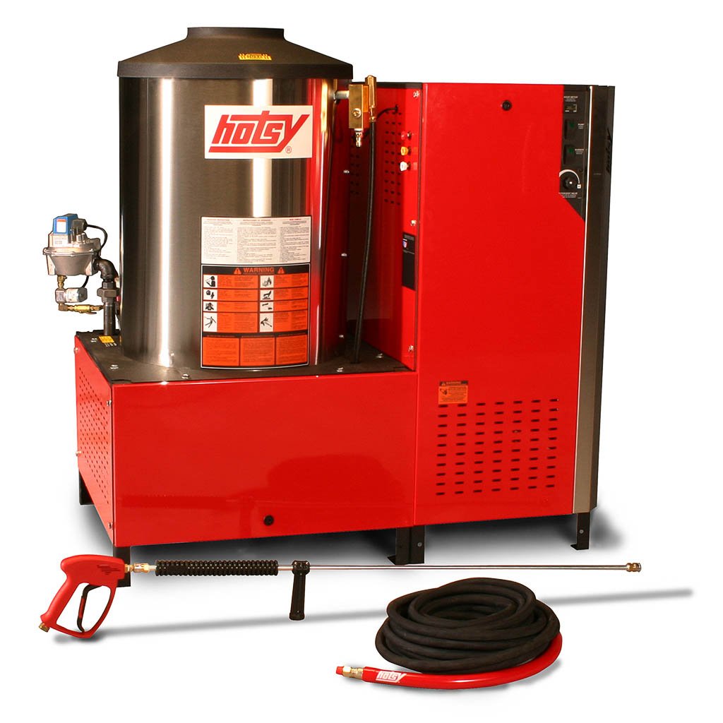 The 1800 Series provides stationary cleaning with hot water indoors. The 7 models are electric-powered and natural gas, oil or optional LP gas-heated. The coil skin comes standard with stainless steel. The sleek cabinet has removable side and front panels, making it easy for routine scheduled maintenance and service. The Smart Relay allows the washer to be customized to individual needs, and is protected behind the front panel. All models are certified to the rigid UL-1776 safety standards and feature the highly efficient Hotsy Triplex pump. A pressure switch is a standard feature on all 1800 Series models. Equipped with a 50′ hose.
