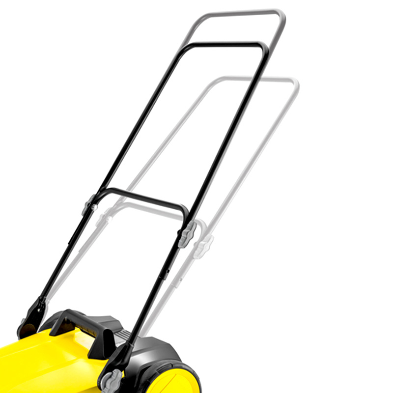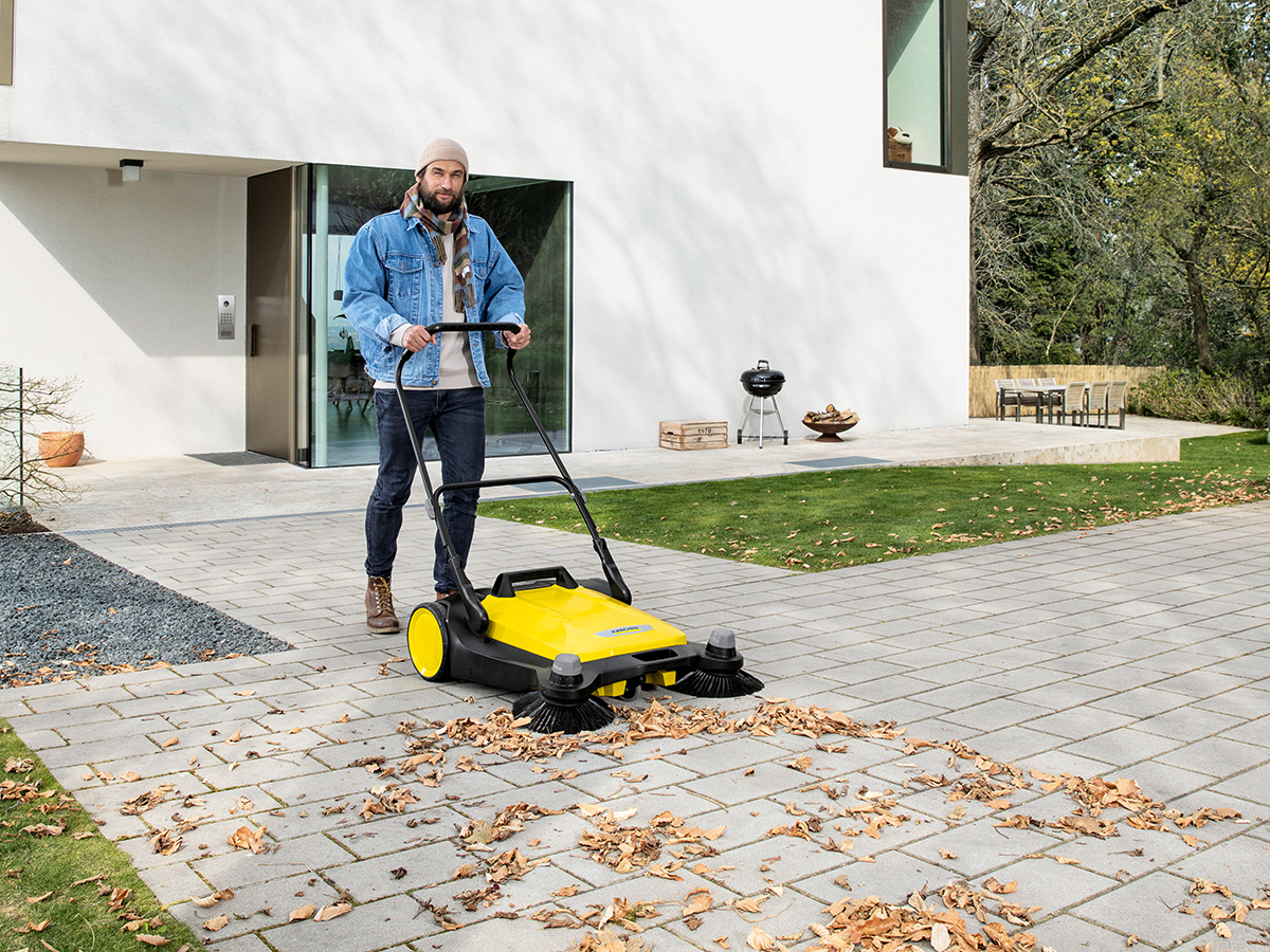Greatly reduce the amount of time required to sweep your driveway, sidewalks, garage and other large areas with the S 4 Twin Push Sweeper. This sturdy, corrosion-resistant sweeper has a total sweeping width of 26.8″ and features a powerful roller brush and two side brushes. It is ideal for areas 400 ft² or larger. The mechanical sweeper draws debris directly into its 5.25 gallon waste container and delivers outstanding cleaning results. It’s extremely easy to maneuver, and the extra long bristles on the side brushes ensure thorough cleaning right up to edges. The adjustable, infinitely variable push handle can be easily adjusted to the height of each user (or completely folded down, if desired, for self-standing storage). The waste container can be easily removed and emptied without coming into contact with dirt. The S 4 Twin is exponentially quieter than a blower and captures dust, rather than blowing it around. Its push-powered design means no electricity or gas is needed.